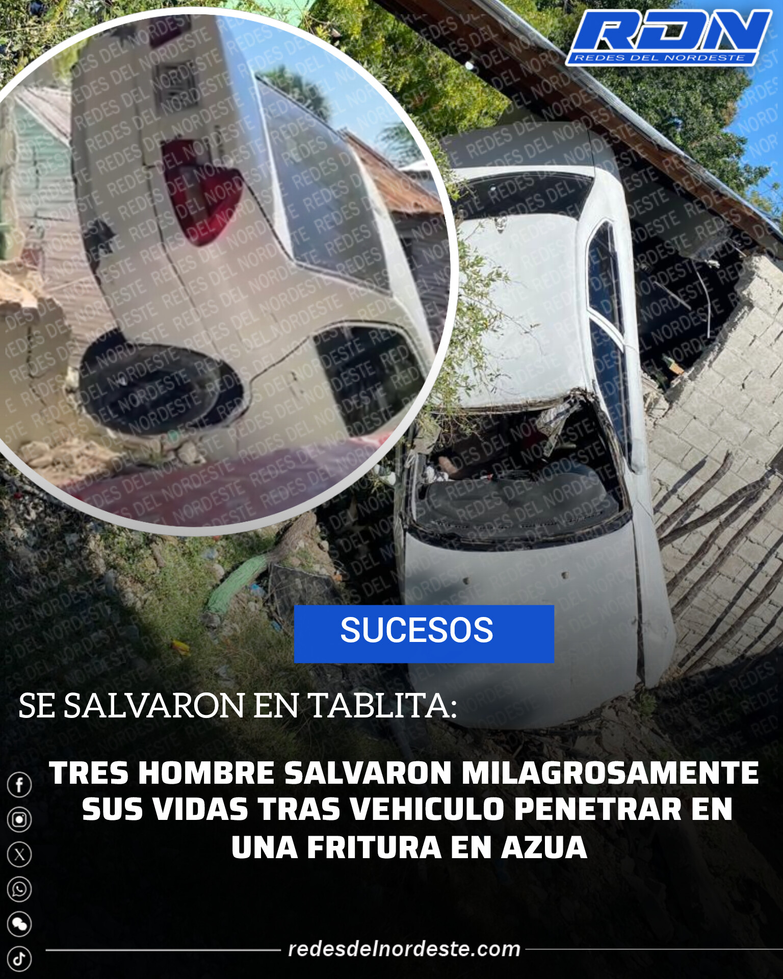 SE SALVARON EN TABLITA: TRES HOMBRE SALVARON MILAGROSAMENTE SUS VIDAS TRAS VEHICULO PENETRAR EN UNA FRITURA EN AZUA